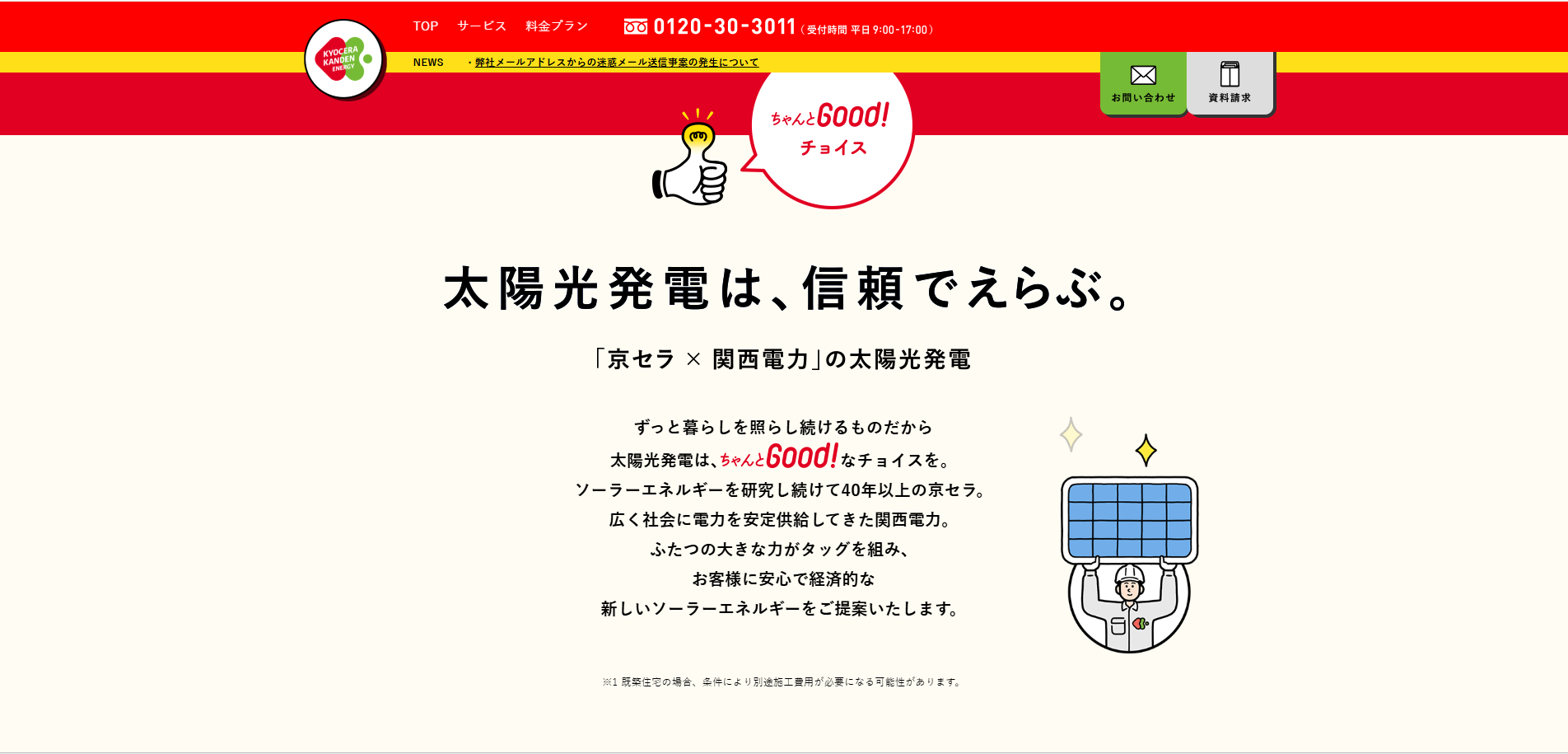 太陽光・蓄電池の「専門家」ですか? | 〇 | 京セラの技術力と関西電力のエネルギーサービスの知見を併せ持つ、まさに住宅エネルギーの専門家集団と言えます。専門性は非常に高いです。 |
