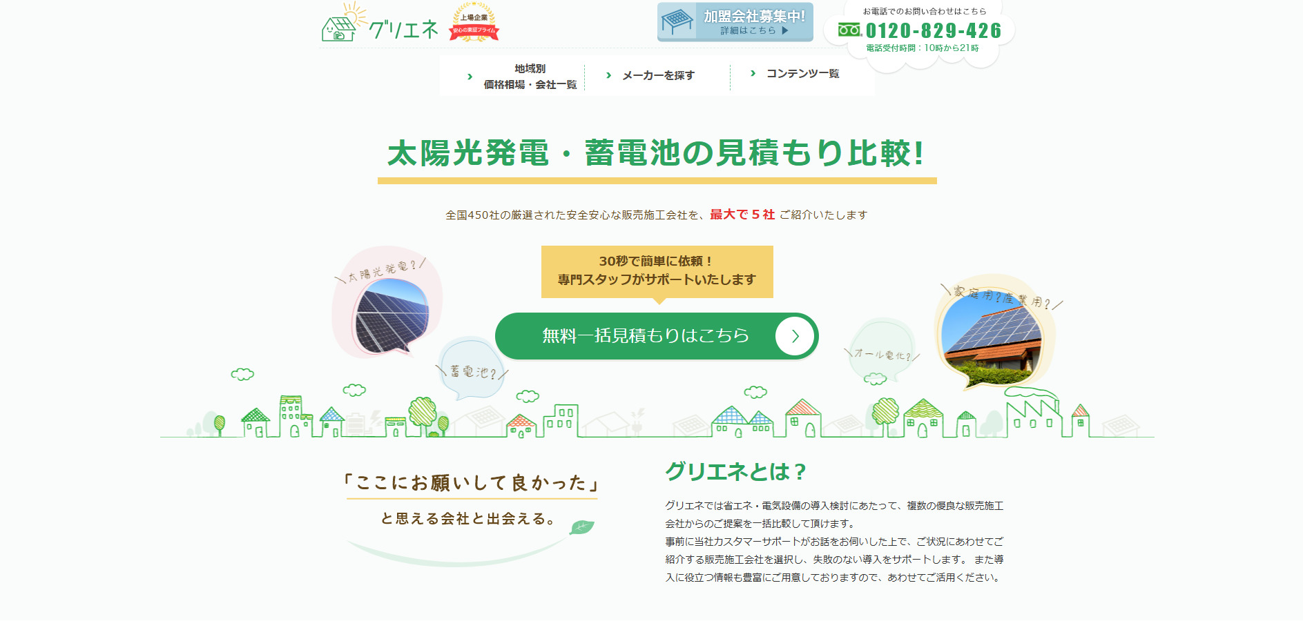 株式会社グリエネは、主に太陽光発電システムや蓄電池、エコキュートといった住宅用エコ関連設備の販売・施工を手掛けている会社です。Webサイトや訪問販売などを通じて、全国的に事業を展開しています。
