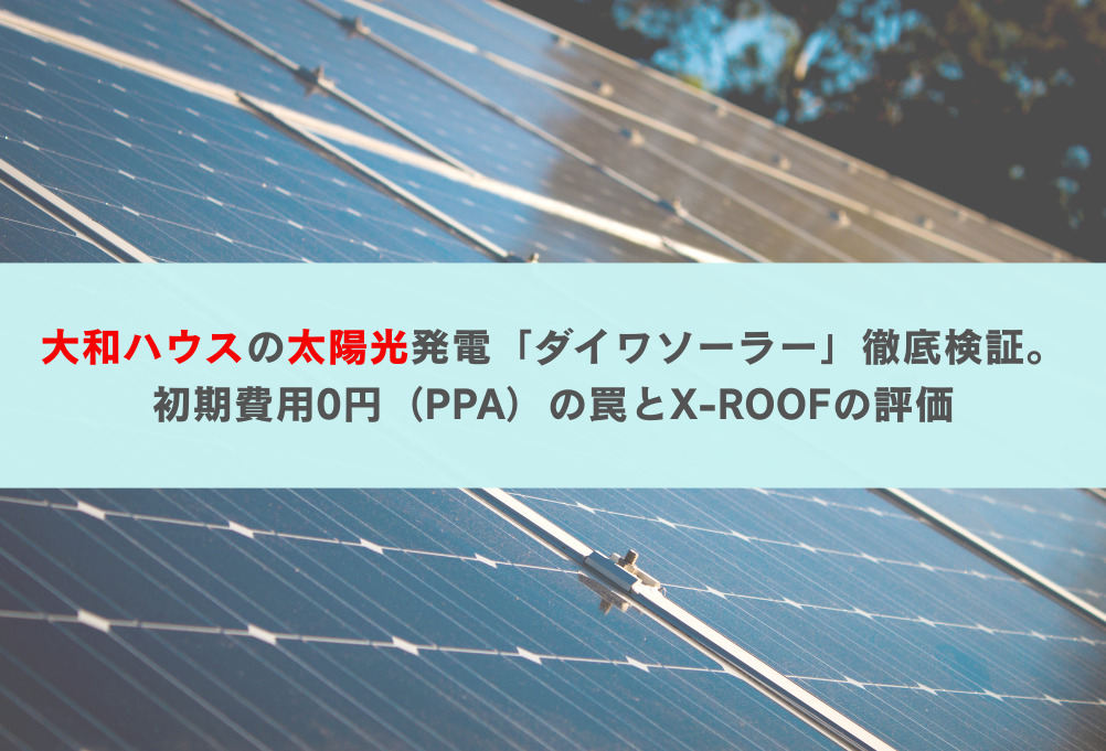 パナソニックホームズの太陽光発電と専門店ならどっちがお得? 太陽光発電 2024年01月04日更新 スウェーデンハウスの太陽光発電の価格はお得?【3つの注意点】 太陽光発電 2024年01月04日更新 太陽光発電の寿命は何年?経年劣化や劣化起因の火災リスクについても 太陽光発電 2024年01月04日更新 トヨタホームの太陽光発電は後付け対応!【価格や保証を比較】 太陽光発電 2024年01月04日更新 大成建設が提供する太陽光発電とは?【専門販売店がおすすめ】 太陽光発電 2024年01月04日更新 太陽光発電で元は取れる?初期費用の回収や経済メリットについても! 太陽光発電 2024年01月04日更新 ヘーベルハウスの太陽光発電|費用相場と後付けの「保証」を徹底解説 太陽光発電 2025年10月29日更新 大和ハウスの太陽光発電「ダイワソーラー」徹底検証。初期費用0円(PPA)の罠とX-ROOFの評価 太陽光発電 2025年10月28日更新 99 / 133«最初<...9899100...>最後»